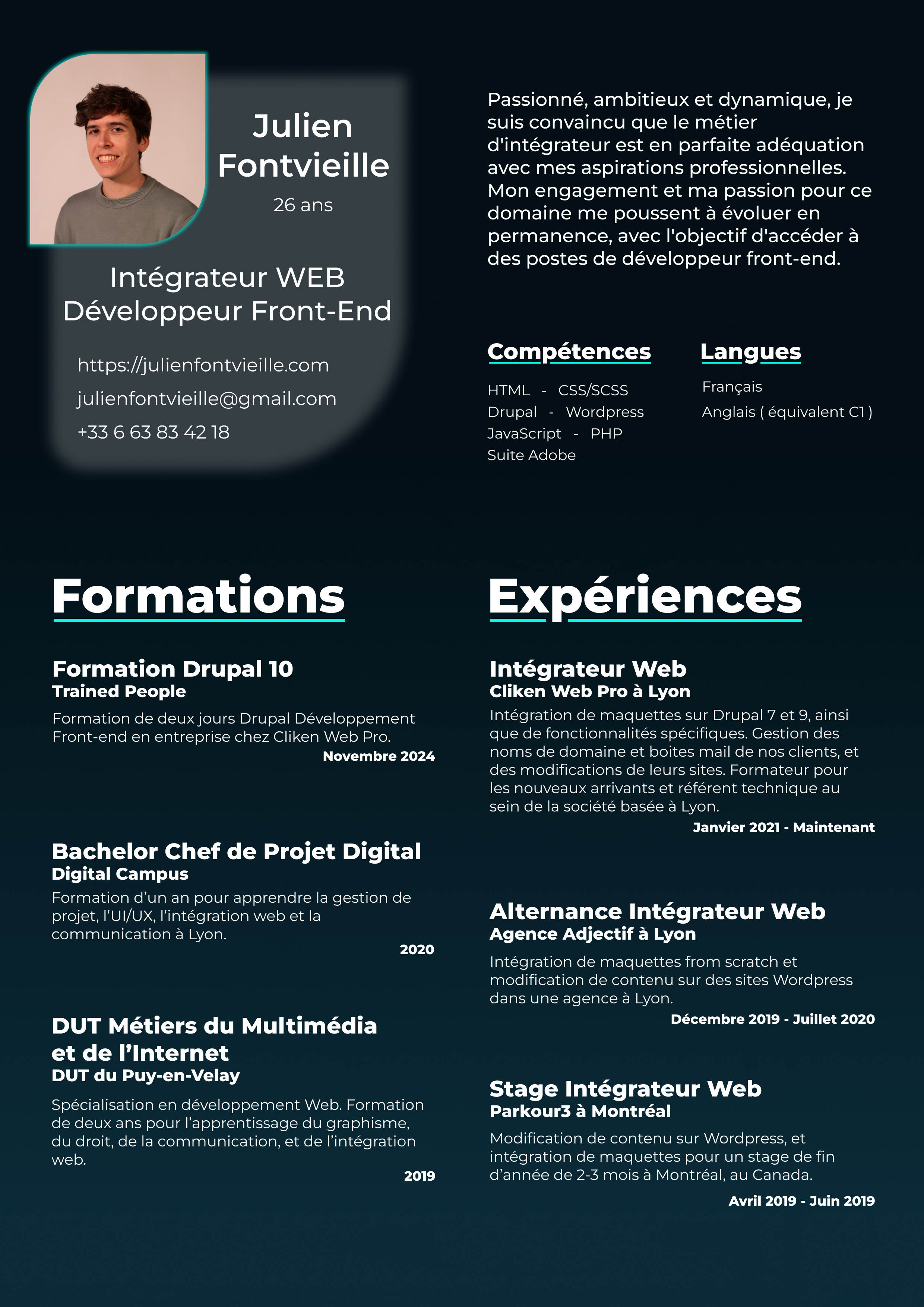 Mon expertise couvre l’intégration HTML / CSS / SCSS, JavaScript, l’intégration responsive, le développement de thèmes Drupal 7 à 11, l’intégration Twig et la création d’interfaces sur WordPress – via Elementor ou des templates personnalisés.